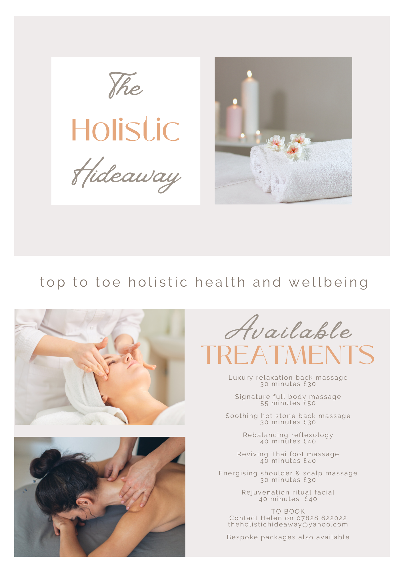 Tara offers a range of treatments including massage, aromatherapy, Hot Stones, Scrub and Steam, Facials, Indian Head massage, Reflexology and much more. Check out her web site here, or her facebook page here. She is highly recommended by our previous guests.